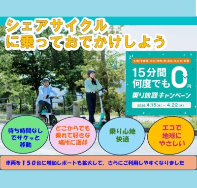 シェアサイクル15分、何度でも無料キャンペーンのお知らせ