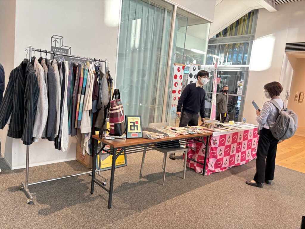 津市の伝統工芸品である臼井織布株式会社の「伊勢木綿」で制作したオリジナル衣装を、スガ シカオ氏がライブステージにて着用しました。写真のような赤と黒の伊勢木綿の特製シャツはスガ シカオさんにとってもお似合いでした。他の伊勢木綿の衣装展示も行いました