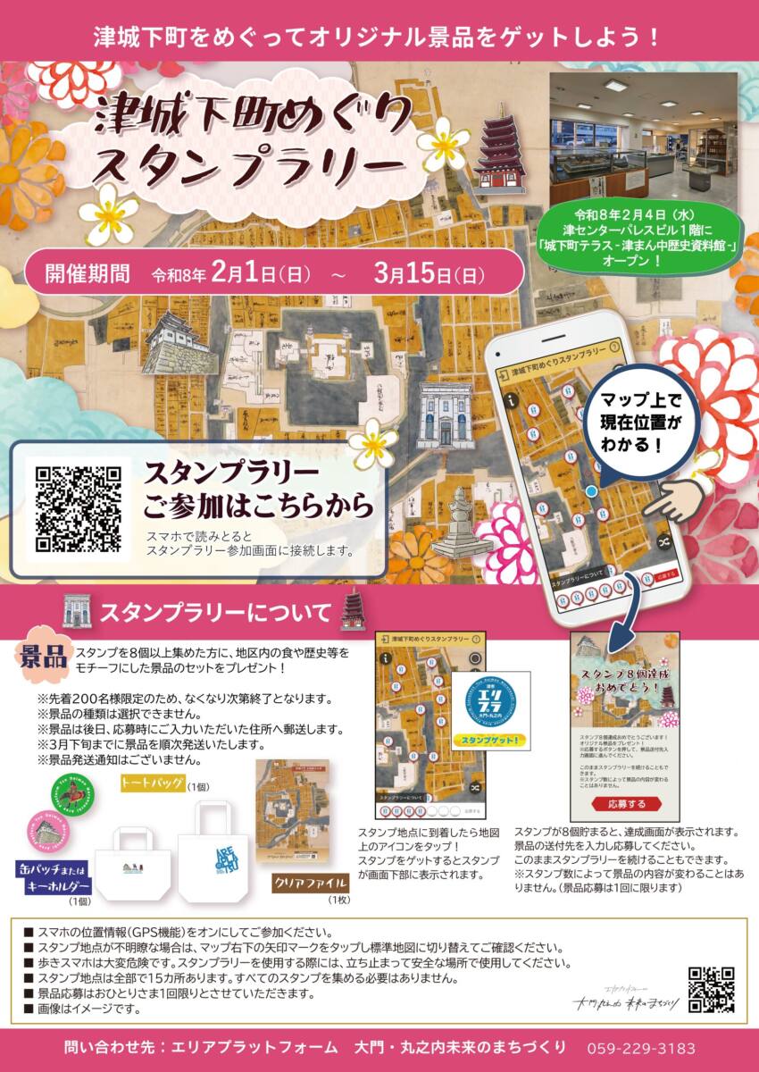 城下町テラスオープン情報! 公開日:2026/01/27 更新日:2026/02/02 城下町テラスオープンのお知らせ 津センターパレスビル1階に、2月4日(水)から「城下町テラス ー津まん中歴史資料館ー」が開設されます!! 城下町テラスは、エリアプラットフォーム「大門・丸之内 未来のまちづくり」が実施するもので、その内容は、津城下の復元模型や、藤堂高虎の甲冑展示・顔出しパネルなど、歴史を身近に感じられる資料館としての機能と、飲食や勉強、仕事など日常的に利用できるテラス空間を兼ね備えた新たな交流スポットです。【オープニングセレモニー】 令和8年2月4日 午前9時30分から【オープン】 令和8年2月4日 午前10時から【場所】 津センターパレス1階(津市大門7-15)【入館料】 無料 皆さまのご来場をお待ちしております見どころ 津城下の復元模型や城下町の地図、藤堂高虎の甲冑など、これまで市内各所に散らばっていた、数々の逸品を一同に集めました。 実際の石垣を眺めながら、復元模型などを見ることができるので、かつてのお城や石垣、お堀などの実像をイメージしやすい展示となっています。是非この機会をお見逃しなく。スタンプラリー令和8年2月1日(日)~3月15日(日)まで「津城下町めぐりスタンプラリー」を実施。スタンプを8個以上集めた方にオリジナル景品をプレゼント!詳細はこちらをクリックしてください。 詳細・お問い合わせエリアプラットフォーム「大門・丸之内 未来のまちづくり」事務局 津市都市計画部都市政策課内 059-229-3183