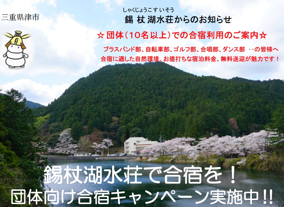 錫杖湖水荘で合宿を! 公開日:2026/02/15 更新日:2026/02/15 【錫杖湖水荘からのお知らせ】津市芸濃町にある宿泊施設「錫杖湖水荘」は、安濃ダムの湖畔に立地する自然豊かな環境のなかにあって、お値打ちな宿泊料金と静かな環境は、クラブ活動等での合宿にとっても適しています。錫杖湖水荘では、その長所を活かして、現在、合宿キャンペーン実施中です。主要駅からのマイクロバスでの送迎(無料)もあるので、ちょっとした団体旅行気分で心身のリフレッシュにもなりますし、モチベーションがあがることまちがいなし。とてもお値打ちな内容となっていますので、是非、この機会にご利用を! 当キャンペーンの詳細は、コチラなお、施設の詳細は、錫杖湖水荘の公式ホームページ→コチラをご確認ください。 錫杖湖水荘 住所:津市芸濃町河内679 電話:059-265-2019 More »