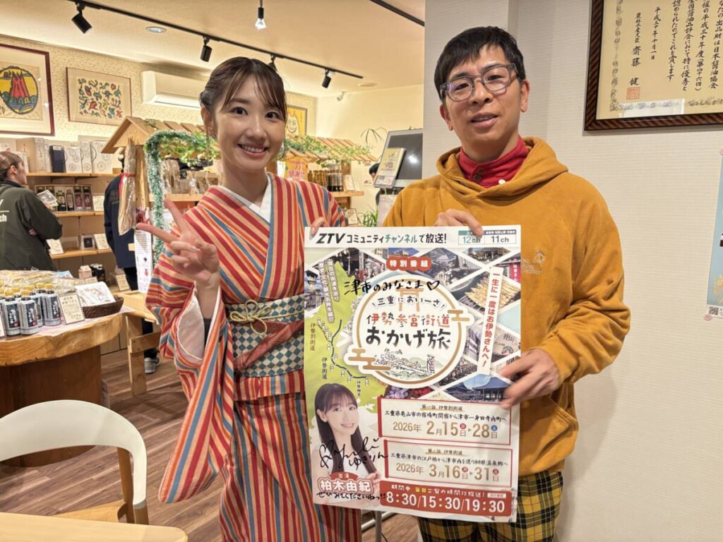 柏木由紀の「三重においーさ!伊勢参宮街道おかげ旅」 公開日:2026/02/17 更新日:2026/02/17 【ZTV特別番組「三重においーさ!伊勢参宮街道おかげ旅」のお知らせ】元AKB48の柏木由紀さんが旅人となり、三重県内をぐるりと回る番組です(全6話)第1話2月15日~28日の8:30、15:30、19:30から、各30分をZTVで毎日放送第1話は、伊勢別街道で亀山市の宿場町関宿から津市一身田寺内町へ高田本山専修寺、一身田寺内町、臼井織布、下津醤油など、見どころ満載ぜひお見逃しなく柏木さんが行った場所は、◆高田本山専修寺 公式Hp、インスタ…@takadahonzansenjuji◆伊勢木綿の臼井織布 公式Hp、インスタ… @ise.momen◆岡田屋 公式Hp、インスタ… @okadaya1868◆下津醤油 公式Hp、インスタ… @shimozusoysauceshop放送は…ZTV @ztv_official