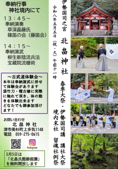 北畠神社 春の大祭のお知らせ 公開日:2026/04/17 更新日:2026/04/17 北畠神社 春季大祭のお知らせ 伊勢国司之宮 北畠神社の春季大祭として、伊勢国司講 講社大祭 留魂社例祭などが斎行されます。 日時:令和8年5月5日(祝・火) 11時 場所:津市美杉町上多気1148 北畠神社 【奉納行事】 13:45〜 篠笛・草深晶藤氏『藤笛会』の奉納演奏 14:15〜『柳生新陰流兵法』『宝蔵院流槍術』の奉納演武 なんと、今年は、奉納演武に併せて、「古武道体験会」も行われます。 柳生新陰流兵法(袋竹刀)宝蔵院流槍術(稽古槍)に触れ、体の動きを体験できるそうです。 他にはない特別な体験会なので、古武道に興味のある方にも是非、お声がけください。 お問い合わせ先 北畠神社 059-275-0615 ※写真は昨年5月5日の様子です。