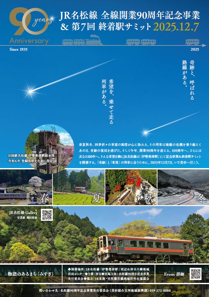 JR名松線90周年記念イベント&終着駅サミット●日時:令和7年12月7日(日)●場所:津市美杉町奥津(名松線伊勢奥津駅周辺)何度にもわたる廃線の危機を乗り越えてきた名松線、なんと今年は90周年を迎えます😊 […]