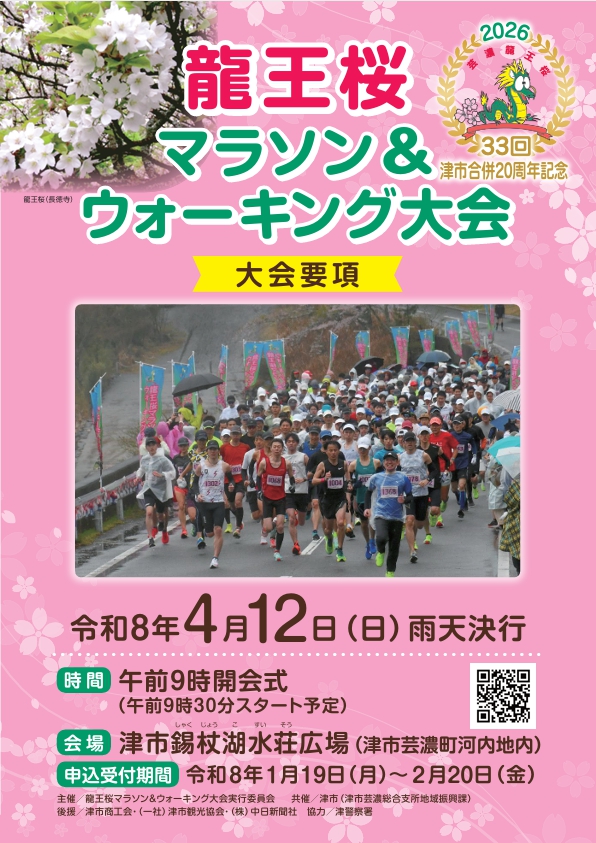 2026龍王桜マラソン&ウォーキング大会 日時: 令和8年4月12日(日)雨天決行●受付8:00~8:50 ●開会式9:00~9:20●スタート9:30(予定) ●表彰式各種目終了後●閉会式11:50(予定)会場:津市錫 […]