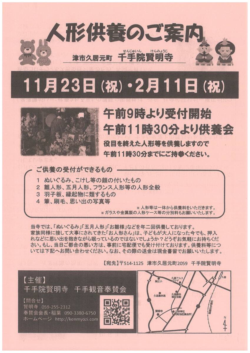 人形供養 津市の千手院賢明寺では、恒例の人形供養が行われます。詳細は、チラシをご覧ください。 日時: 令和8年2月11日(祝) 午前11時30分から供養会※ 受け付けは、午前9時からです。 問い合わせ: 賢明寺(059- […]