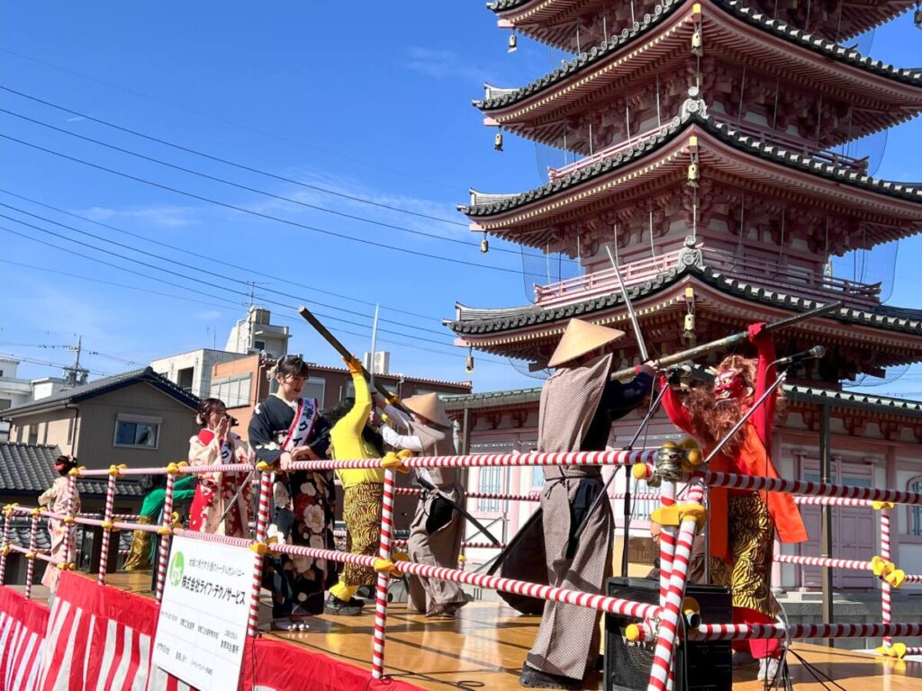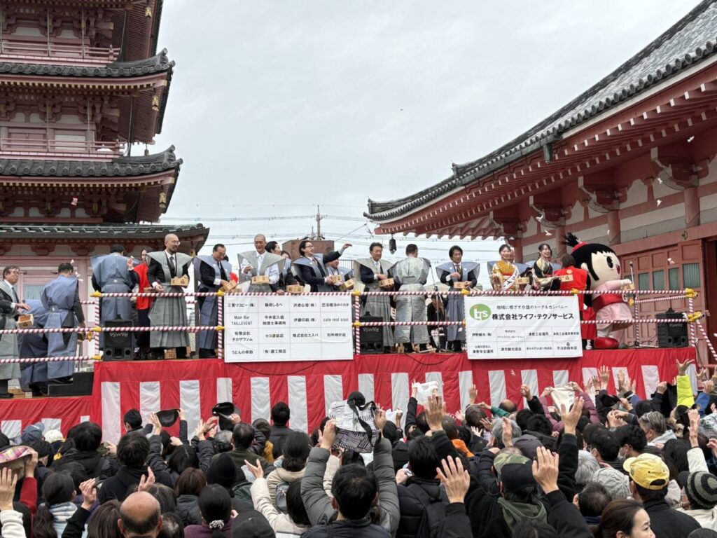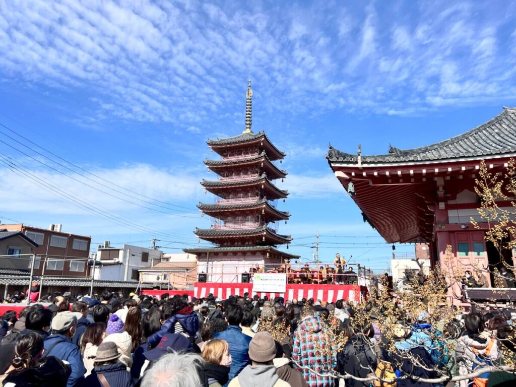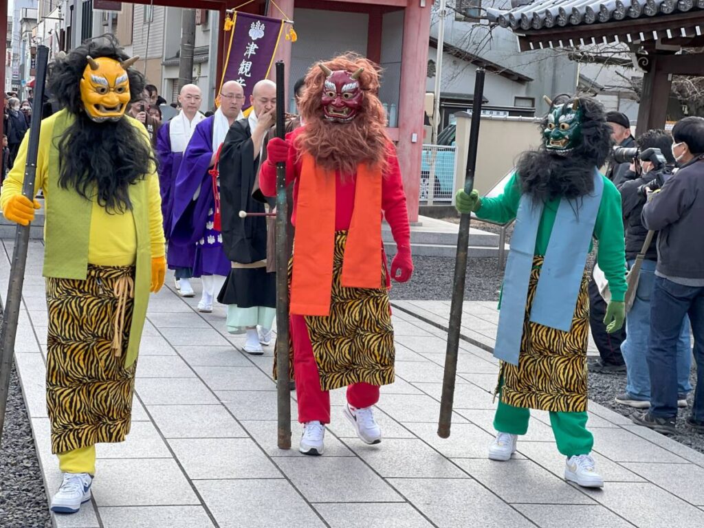 それぞれの時間になりましたら、福豆まきに参加される方、鬼が行列をなして津観音周辺を練り歩きます。ご祈祷が終わり、寸劇、福豆まきのスタートです!