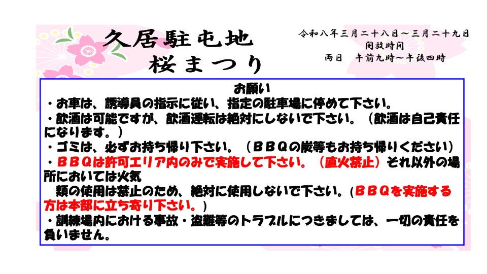 日時:令和8年3月28日(土)29日(日)9:00~17:00場所:陸上自衛隊久居駐屯地グラウンド問合:久居駐屯地広報室(059-255-3133)アクセス:近鉄久居駅から徒歩5分