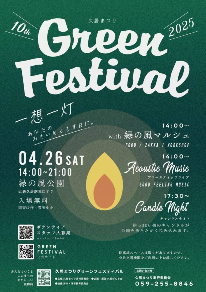 日時:令和7年4月26日(日)14:00~21:00場所:みどりの風公園内容:マルシェ、アコースティックLIVE、キャンドルナイトで盛り上がります!