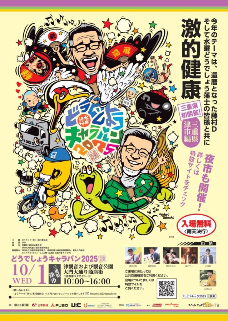 今年は大泉洋さん出演の伝説的バラエティ番組「水曜どうでしょう」とのコラボレーション企画が実現。10月1日(水)に津観音・大門大通り商店街で行われる「水曜どうでしょうキャラバンin三重県津市」の最新情報が本イベントで初公開されます。
