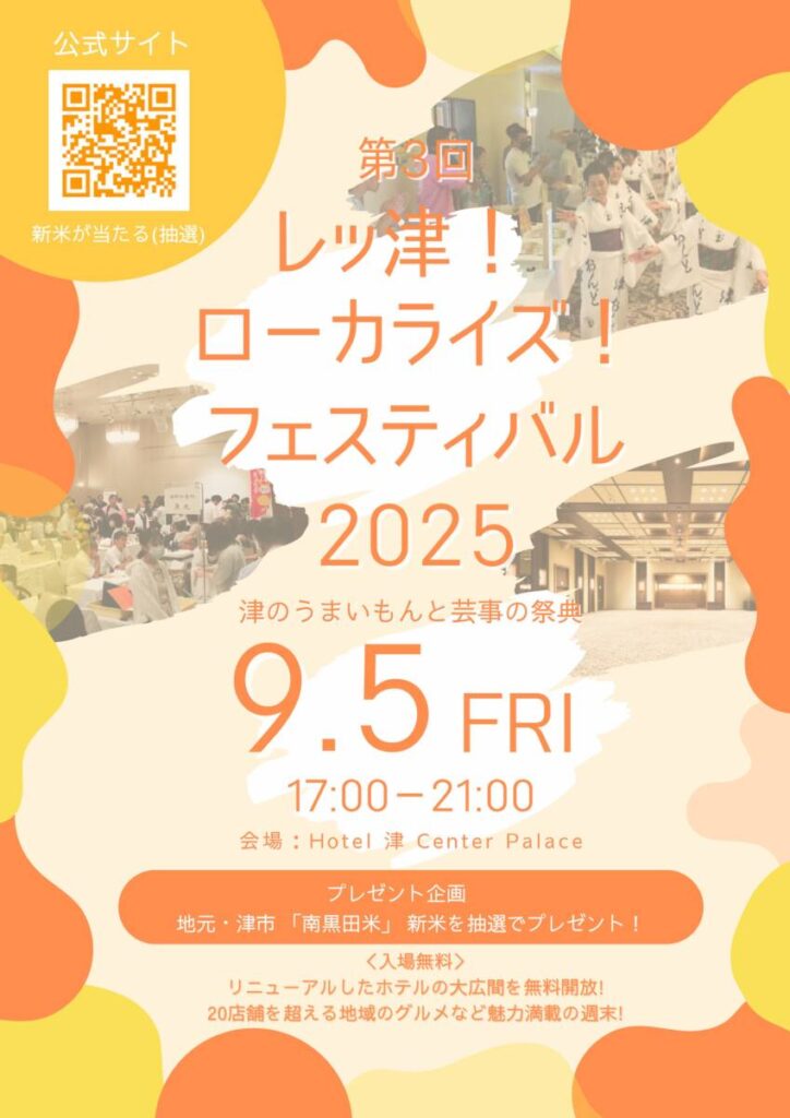 地域密着(ローカライズ)のハブ拠点として、「ホテル津センターパレス」が入場無料で大広間を開放してお贈りするグルメと芸事の祭典「レッ津ローカライズ!フェスティバル2025」のお知らせです。
