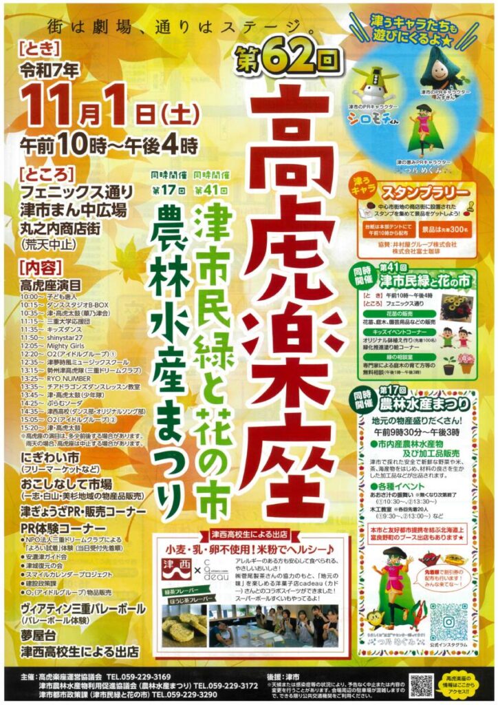 10:00~子ども唐人10:15~ダンススタジオB-BOX10:35~津・高虎太鼓(華乃津会)津西高校吹奏楽部・ダンス部11:15~三重大学応援団11:35~キッズダンス11:50~shinystar2712:05~Mighty Girls12:20~O2(アイドルグループ)①12:35~津夢時風ミュージックスクール13:15~勢洲高虎隊(三重ドリームクラブ)13:25~RYO NUMBER13:35~チアドラゴンズダンスレッスン教室13:45~津・高虎太鼓(少年隊)14:25~ぷらむソーダ14:35~津西高校(ダンス部・オリジナルソング部)15:05~O2(アイドルグループ)②15:20~津・高虎太鼓※高虎座の演目は、多少前後する場合があります。 雨天の場合、高虎座は中止する場合があります。