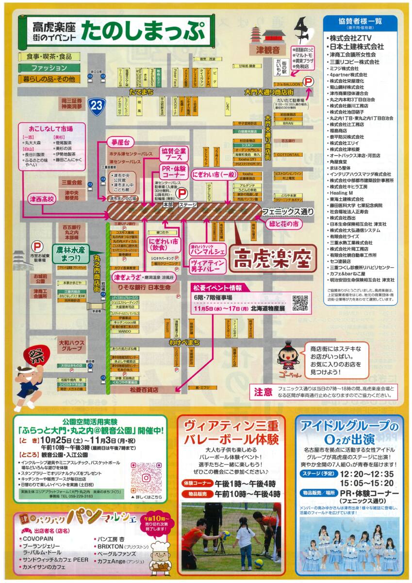 PR体験コーナーNPO法人三重ドリームクラブによる「よろい試着」体験(当日受付先着順)安濃津ガイド会津城復元の会スマイルカレンダープロジェクト建設政策課O2(アイドルグループ)物品販売ヴィアティン三重バレーボール(バレーボール体験)夢屋台津西高校生による出店