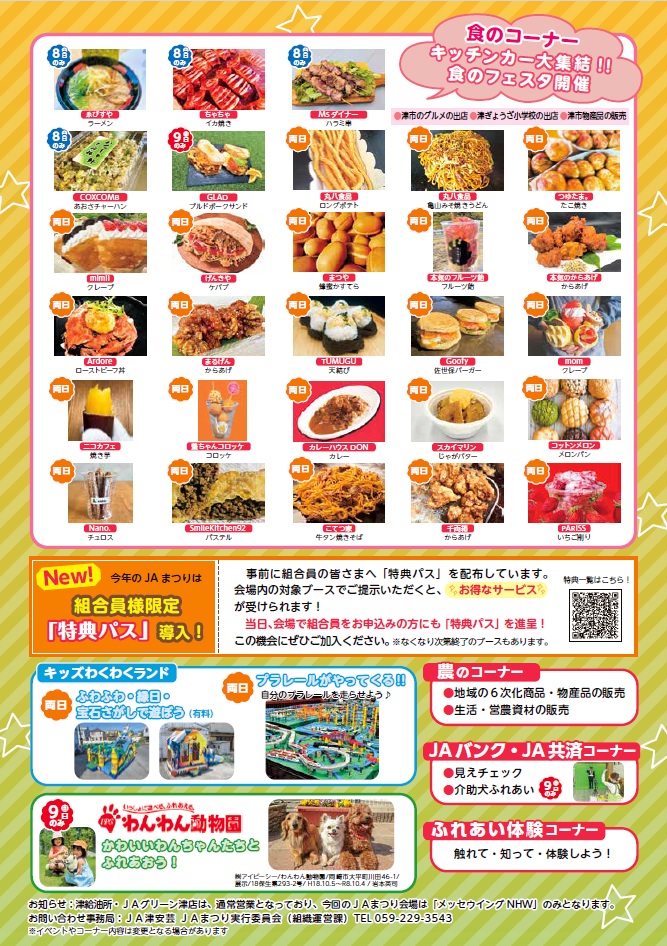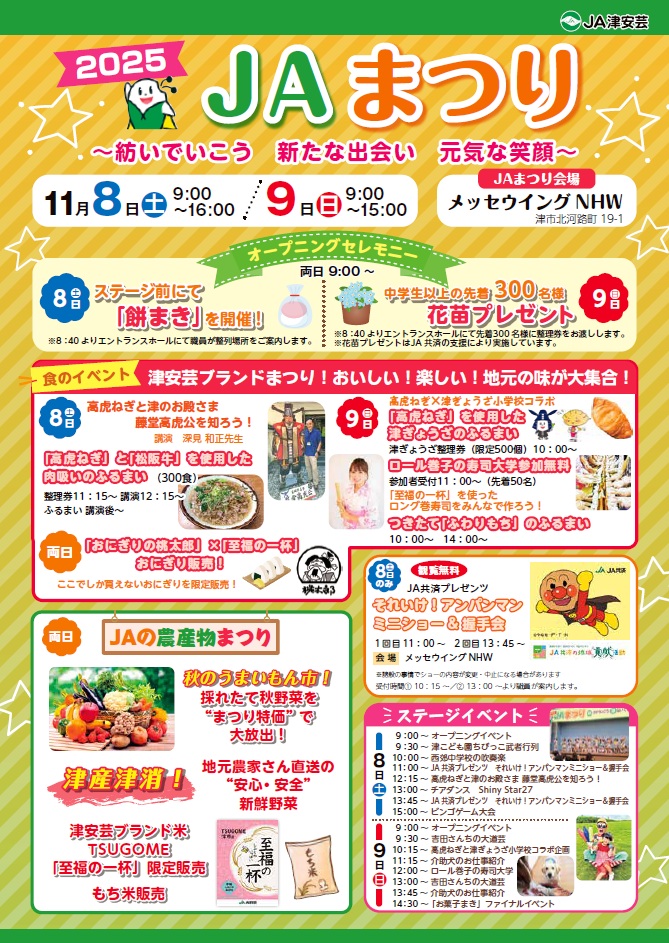 問い合わせ:JA津安芸JAまつり実行委員会(組織運営課)電話059-229-3543