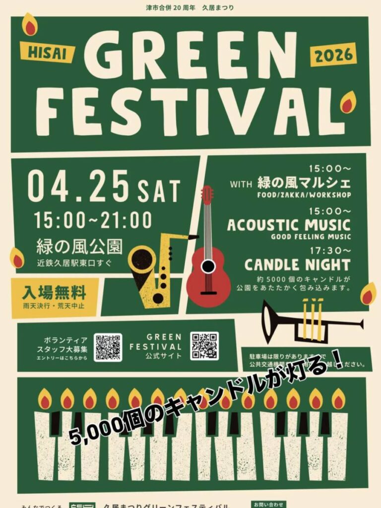 日時:令和8年4月25日(土)15:00~21:00場所:緑の風公園(近鉄久居駅東口すぐ)