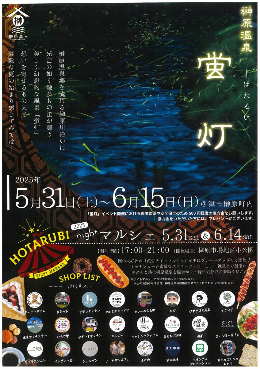 内容:昨年大好評だった榊原温泉蛍灯ナイトマルシェ!出展店舗も増えて、よりお楽しみいただけます。是非幻想的な夜の雰囲気をお楽しみください。