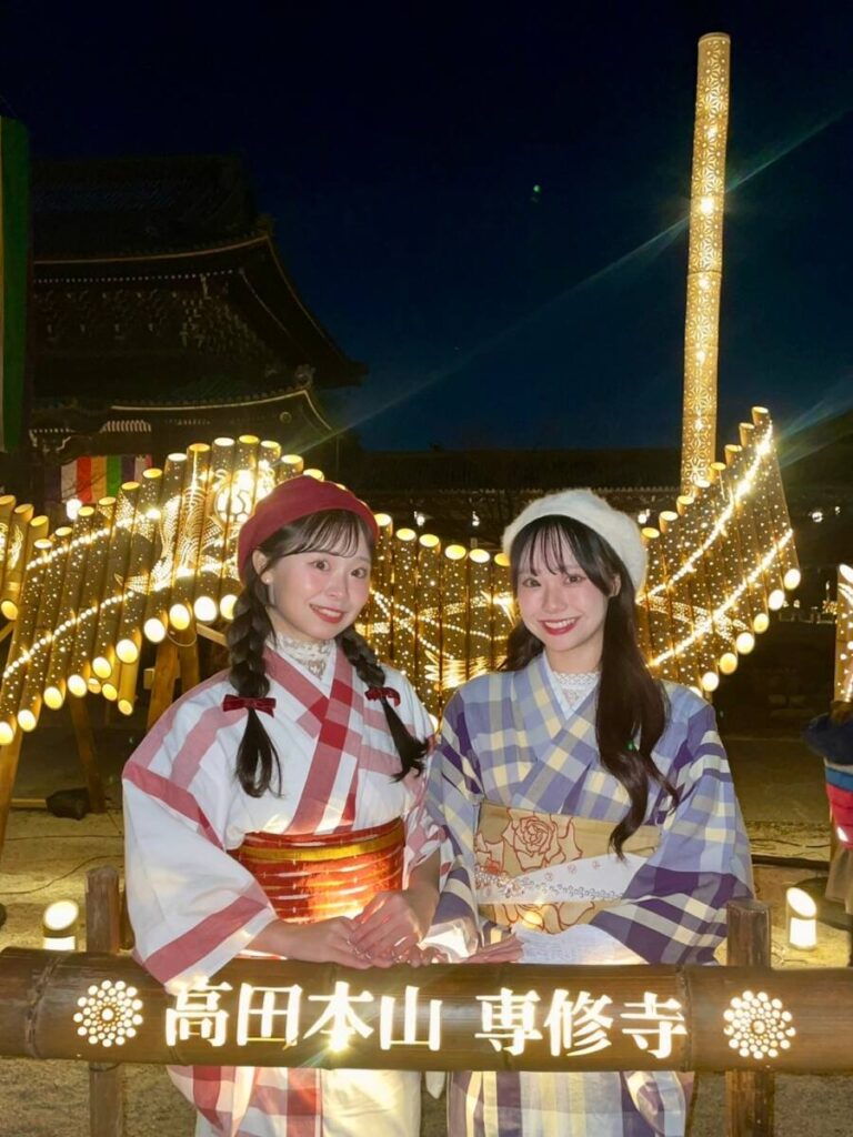 東海地方最大級の竹あかりや楽しいイベントが目白押しの「お七夜」!家族やお友達と素敵なひとときを過ごしませんか? 高田本山専修寺のお七夜は開祖「親鸞聖人」の報恩講であり、専修寺ではもちろんですが、寺内町一帯が屋台やいろいろなお店が出て毎年大いににぎわいます。 どのような楽しみ方があるのか、ご紹介していきます。 前回のお七夜は、2024年度津クイーンのお二人が津市の伝統工芸品である伊勢木綿を着て案内してくれましたので、その様子も参考にしてください! 高田本山専修寺「お七夜」 開催期間:2026年1月9日~16日 見どころ満載のポイント ●竹あかり展示幻想的な竹あかりが寺内を彩ります1月9日~15日:16:30~19:00(15日は23:30まで) 竹あかりの詳細は、コチラ ●お七夜マルシェ例年、寺内町では、地元グルメやスイーツ、大道芸人のパフォーマンスなど、賑やかで楽しいマルシェが行われています。 2026年1月、今回の情報は、まだありませんが、出展者募集はしていたようなので、開催される予定だと思われます。 詳しい情報が入り次第、お知らせします。 あくまでも予想ですが、令和8年1月10(土)~12日(月・祝)に行われる可能性が大きいです。 高田会館では地域の物産展が行われます! ●燈炬殿 燈炬殿(とうこでん)も要チェック!2023年5月にオープンした新宝物館では、貴重な展示や360度VR映像が楽しめます1月9日~2月15日「お七夜特別展観」も開催!歴史と最新デジタル技術の融合で特別な体験をお届けします ※ 燈炬殿特別展覧の詳細は、コチラ みんなで行こう!高田本山「お七夜」家族でも友達でも、誰と来ても楽しめるイベントが盛りだくさん!ぜひ足を運んで、心も体もあたたまるひとときをお過ごしください!! ●交通規制のお知らせ 最後に交通規制のお知らせは、コチラ しっかり事前にチェックして、現地で慌てないように準備してから行きましょう! 伊勢木綿で楽しむお七夜伊勢木綿の着物を着て、写真映え間違いなしのおしゃれな時間を過ごしてみませんか?今回もオカモトヤさんで伊勢木綿をレンタルし仕立てていただきました。ベレー帽やブーツで一味違う伊勢木綿を楽しんでみました。レンタル伊勢木綿はこちらでご予約ください岡本屋呉服店住所:津市一身田町617 電話:059-232-2109More » 休憩スポットも充実寒い冬でも安心!室内で休憩できるスペースもあるので、ゆっくり暖まりながらイベントを満喫できます私たちも寒さのあまり1時間ほど座ってあたたかい飲み物を飲んでいました一身田寺内町の館は無料案内所です。ぜひご利用ください。一身田寺内町の館住所:津市一身田758電話:059-233-6666More »
