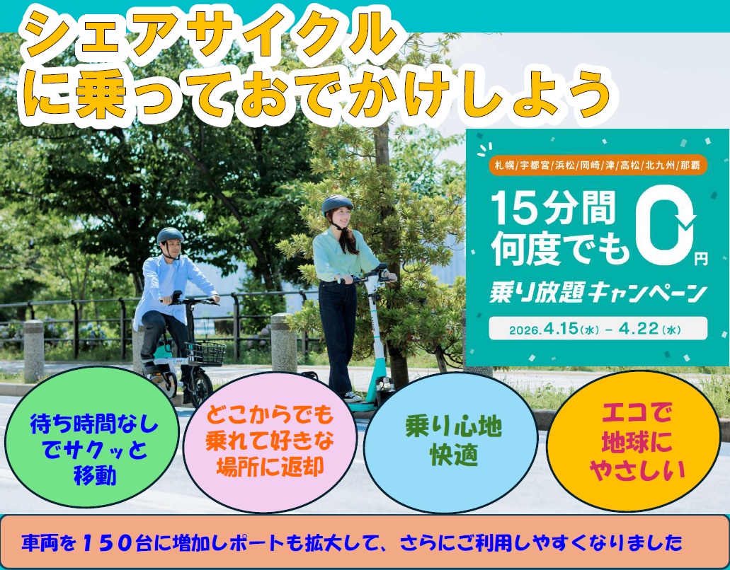 津市のシェアサイクルが驚きの進化!!エリアの拡大、ポートと車両台数を大幅増!! 令和8年度は、さらに充実のシェアサイクル! 令和6年8月26日(月)から、スタートした津市のシェアサイクルが内容を充実させた上で、令和8年度も継続されることになりました! 電動アシスト自転車55台→100台(+45台)に加え、電動キックボード25台を追加!合計150台、住宅地の多い津西エリアのほか、三重大エリア、津新町エリアにもポートが増えました。 「歩くにはちょっと遠いなぁ・・・」そう感じたときには、いろんな場所にポートが配置されているので、一度使ってみてください。レンタサイクルと違って、スマホアプリで手続きができ、ほかのポートに乗り捨てもできるので、とっても便利です。 ポートは、従来の津駅エリア、大門丸之内エリア、津新町駅エリアに加え、津西エリア、江戸橋・一身田エリアにも拡大されています。観光スポット付近にも設置されているので、津市の名所を巡るのにも是非ご利用ください! さあ、シェアサイクルで津の名所を巡ってみよう! → 4/15(水)~4/22(水)の期間は、15分間何度でも0円キャンペーン実施中。是非この機会にご利用ください! ◆シェアサイクルの概要・内容 スマートフォンアプリ「LUUP」を用いて、電動アシスト自転車に乗車し、街じゅうにあるポートからポートへの移動ができます。・利用料金 1基本料金50円+15円/分(税込)、それ以降1分あたり15円(税込)、ほかに、サブスクプラン(月額980円)30分200円でライド可能、アプリから購入できる 乗り放題パス 3時間980円、12時間2,480円もあります。・利用期間 令和8年4月1日〜令和9年3月31日・利用可能時間 24時間・利用方法 「LUUP」アプリをダウンロードして利用 ※ ダウンロードは、こちら(LUUPサイト)※利用方法・ルールは、こちら(シェアサイクルのご案内(津市HP))、チラシはこちら 再スタート後も、ポートが続々と増えていて、さらに充実、便利になっています!自宅付近、勤務先、よく行く場所や駅周辺は、再チェックして、便利に使おう! 津市内主なループ(LUUP)ポートの紹介(一例です) ◆津駅 東口(駅前広場)タクシーロータリーの『津ぅのうなぎ』の看板が目印です!津駅を出たところにあるタクシーロータリーとパーキングの一角にあります。ここ津駅周辺は、電動アシスト自転車なら、津城跡、高田本山まで10分程度のところにあります。三重県総合博物館MieMuも10分程度、三重県立美術館5分程度など、文化施設が多いエリアとなります。MieMuや美術館は、津駅西口のポート(津駅西口、津偕楽公園)がオススメです。 詳細地図はこちら ◆津駅東口(第一ビル西(津駅の南))駅前広場の南にある赤茶色のビルの西側(線路側)です!駅前広場のすぐ近くです。第一ビルと線路の間にある道路沿いに並んでいます。 詳細地図はこちら ◆津駅東口(三交ビルディングアネックス(津駅の北東))津駅の北東(駅を出て左斜め前)、透明感のあるビルの階段下にあります!駅前広場の北東にある、透明感のある新しいビルの階段下にあります。駅前広場の隣のバスターミナルの向かい側にあります。 詳細地図はこちら ◆津駅西口(津偕楽公園前駐輪場)津駅西口から徒歩2分、津偕楽公園の東側(駅側)にあります!津駅西口の近くにある津偕楽公園の道路を隔てた向かい側の市営駐輪場の一角にあります。 詳細地図はこちら ◆津偕楽公園津駅の西口から徒歩2分、津偕楽公園の時計のたもとにあります!津駅西口の近くにある津偕楽公園の一角、津駅西口交差点の隣にあります。 詳細地図はこちら ◆津センターパレス(大門)津センターパレスとまんなか広場の間にあります。大門商店街や津観音へのアクセスがいいポートです。天むす発祥の『千寿』や津市民が愛してやまない『蜂蜜饅頭』など、グルメスポットが多いエリアです。 詳細地図はこちら ◆津市役所(東側駐輪場)(西丸之内)市役所前の駐輪場です(法務局向い)市役所からは新町通り商店街が近く、いたろうや金鍋、氷花餃子などの津ぎょうざ取り扱い店が多いエリアです。津城などもスポットも近いので、史跡めぐりが楽しんでいただけます。詳細地図はこちら ◆津観音 五重塔西側(大門)五重塔の西側にさりげなくループポートがあります。電動アシスト自転車なら、津駅から津観音まで10分程度、お城公園へは5分程度でスムーズに行けるかと思います。津なぎさまちにもポートがあるので、船に乗ってセントレアまでの観光も可能ですね!詳細地図はこちら ◆お城東駐車場(北側)(丸之内)百五銀行本部棟の西側(裏手)、センターパレスとお城公園ポートの中間辺りにあります。三重会館の近くになります。詳細地図はこちら ◆お城公園東側(丸之内)続日本100名城に指定された津城の石垣に隣接(東側)しています。三重櫓のすぐそばにあるので、石垣や櫓の写真もぜひ撮ってみてくださいね。 詳細地図はこちら シェアサイクルのポスターは、こちら