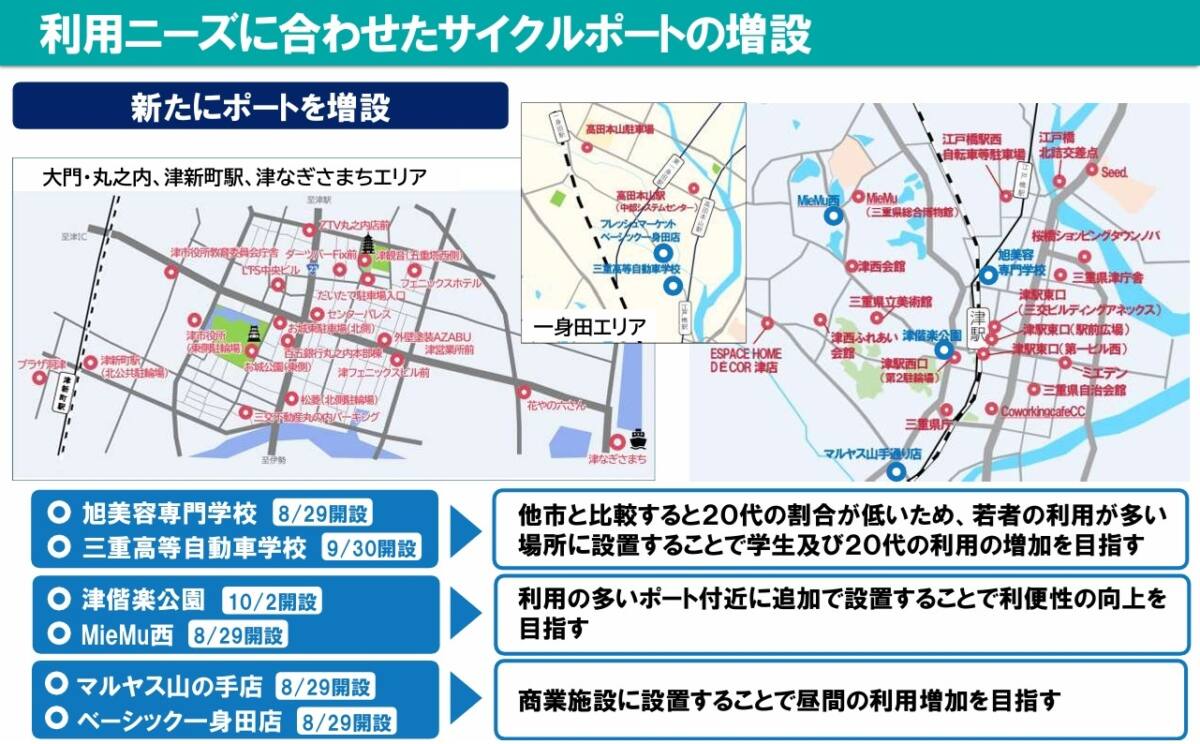 ポートは、従来の津駅エリア、大門丸之内エリア、津新町駅エリアに加え、津駅西エリア(三重県庁、美術館、博物館など)、江戸橋・一身田エリア(三重大学周辺、高田本山)などの観光スポット付近にも設置されているので、津市の名所を巡るにはとても便利!
