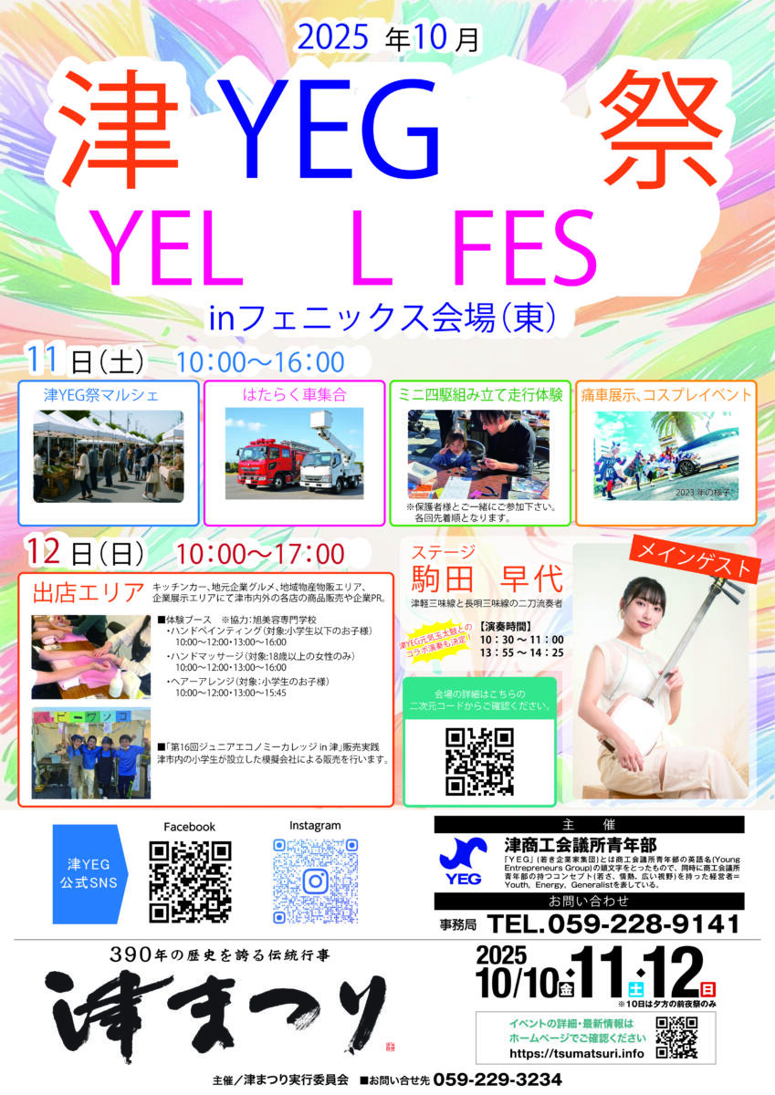 → YEG会場ポスター(駒田早代(津軽三味線)、マルシェ、はたらく車、ミニ四駆、痛車展示、コスプレイベントなど)