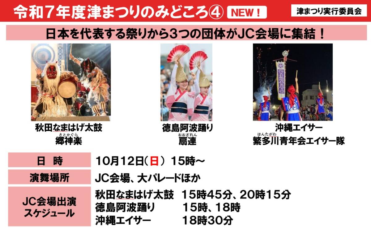 〇イベント系の見どころ(大パレード、お城西公園特設ステージ、安濃津芸能絵巻、津・郷土芸能の集い、本場の秋田なまはげ、徳島阿波踊り、沖縄エイサー、美杉手筒花火)
