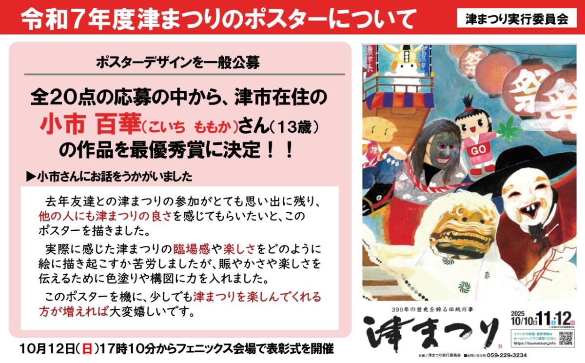 津まつりポスターは、最近は一般公募で作成しています。今年は、小市さんが最優秀賞です。作者の思いなどもご覧いただければと思います。