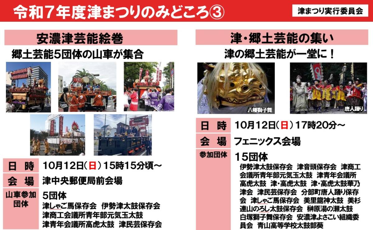 ※ 津まつり実行委員会は、郷土芸能団体、津市自治会連合会、津市内の商工業・サービス業団体、津まつりの趣旨に賛同する団体で構成。