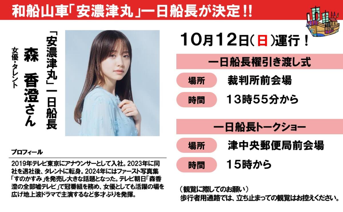 いつもお馴染みのタレントさんや俳優さんがきてくれるので、これを楽しみにしている方も多いと思います。今年の一日船長は、2024年に写真集「すのかすみ」を発売して大きな話題となり、現在女優としても活躍の場を広げている、森 香澄さんです!! 和船山車の上の森さんに早く会いたいですね!