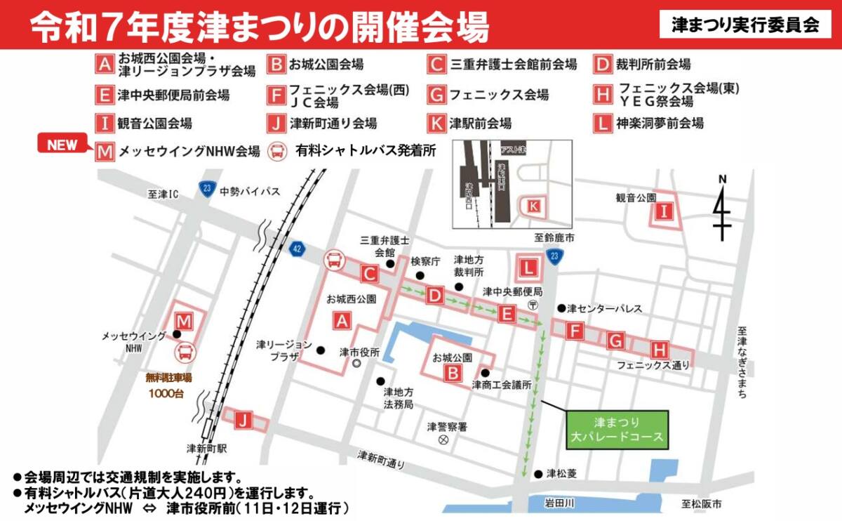 ・自家用車でお越しになる場合は、津市・産業スポーツセンターに駐車(駐車無料)して、シャトルバス(片道大人240円、小人120円)で会場付近に向かうのが便利です。当日、会場周辺の駐車場は、ほぼ満車になりますので会場付近での駐車はオススメできません。
