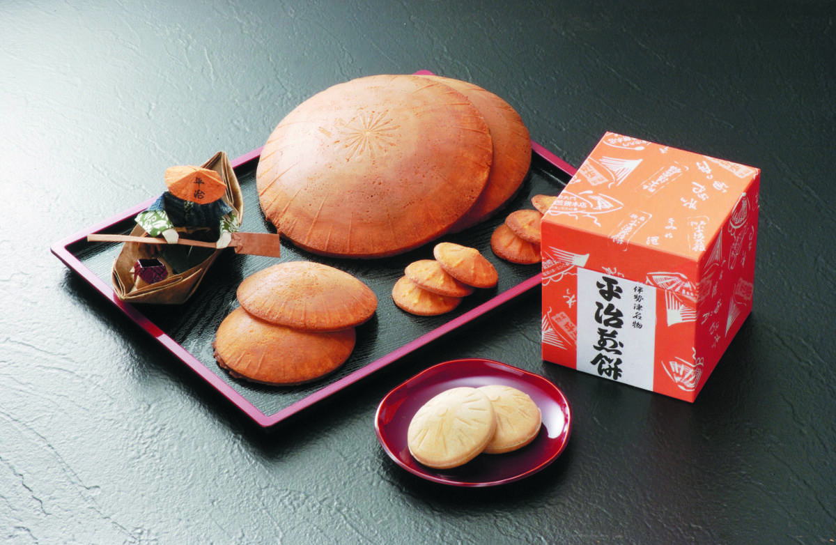 看板商品である「平治煎餅」は、直径約4cmの小さな笠の形をした卵煎餅です。その形状は、津市の阿漕浦に伝わる「孝子平治伝説」に由来しています。